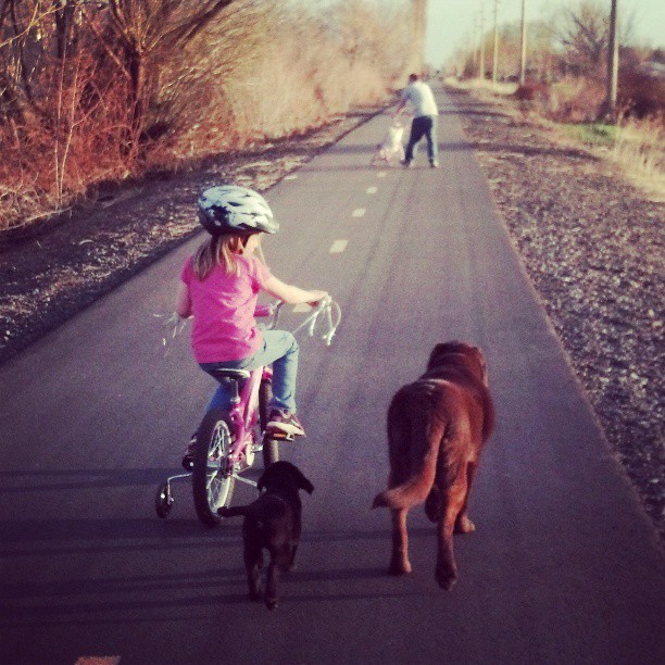 The whole family took a Sunday stroll together. Even Blu tagged along. Well, pulled us along. We went to visit Blu's half-sisters, which were supposed to be one half-sister and one half-brother who we are bringing home for a few days until we can get him, well, her to our nephew.